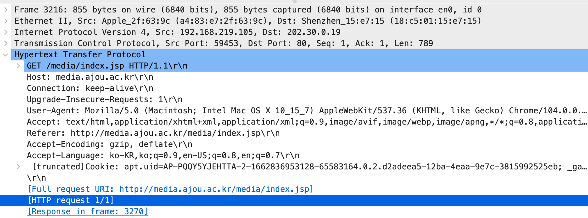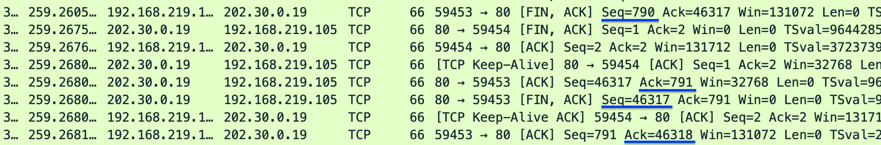 송신 포트(client)의 number는 랜덤으로 생성된 59453번이고 수신 포트(server)는 http 프로토콜의 포트 번호인 80번인 것을 확인할 수 있습니다.