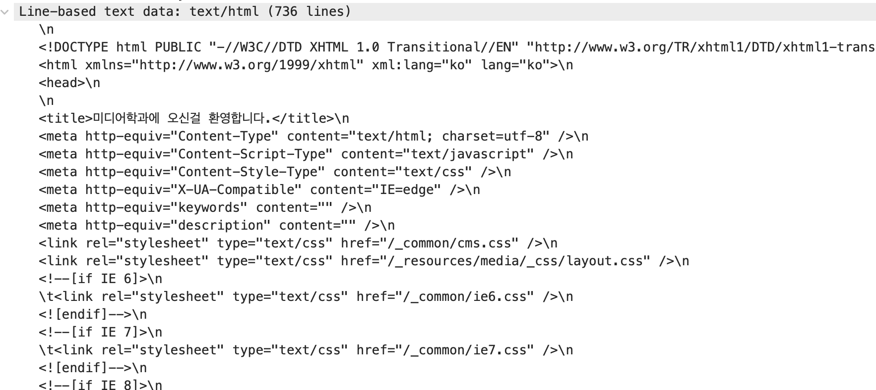 HTTP 응답 패킷을 확인해보면 헤더와 본문 정보를 쉽게 볼 수 있으며, Line-based text data 항목에서 HTML이 평문으로 전송된 것을 확인할 수 있습니다. 이렇게 데이터가 암호화되지 않고 평문으로 전송되는 경우, 특히 사용자 인증과 세션 관리와 관련된 중요한 데이터가 노출될 가능성이 있어 주의가 필요합니다. HTTP를 사용하는 경우에는 이러한 보안 문제를 꼭 고려하고 HTTPS와 같은 보안 프로토콜을 활용하여 데이터를 안전하게 전송해야 합니다.