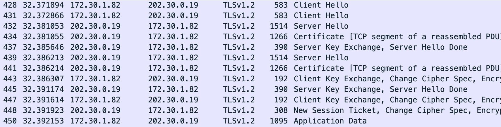 서버와 클라이언트가 주고 받은 데이터 정보를 확인해보면 패킷이 암호화되어 client가 요청한 리소스, 브라우저 유입 경로 등에 대한 정보를 확인할 수 없다는 것을 알 수 있습니다.