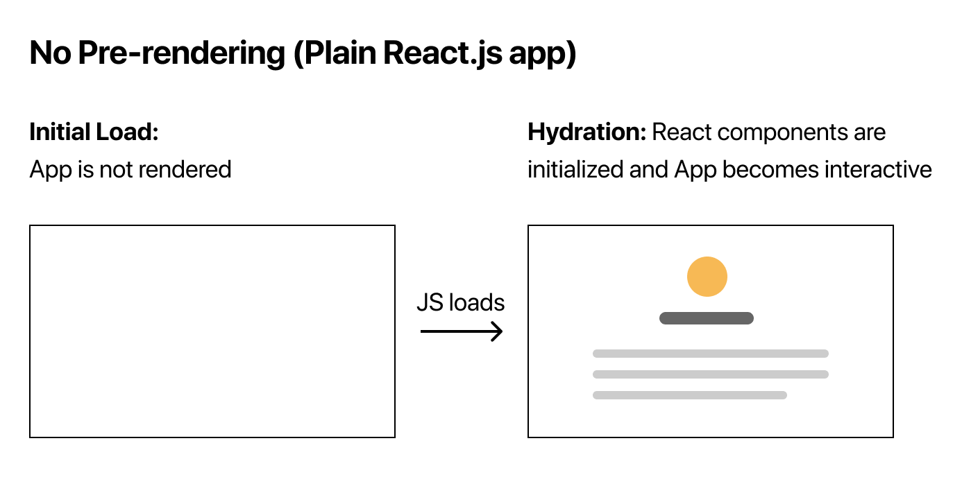 서버에서 HTML 요소를 모두 구성한 후 클라이언트에 전달해주는데, 이때 클라이언트가 전달받은 HTML은 정적인 뷰에 해당하고 Javascript 번들 파일이 로드되기 전이므로 Pre-Render 상태에서 인터렉티브한 동작이 불가한 상태입니다.